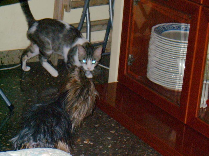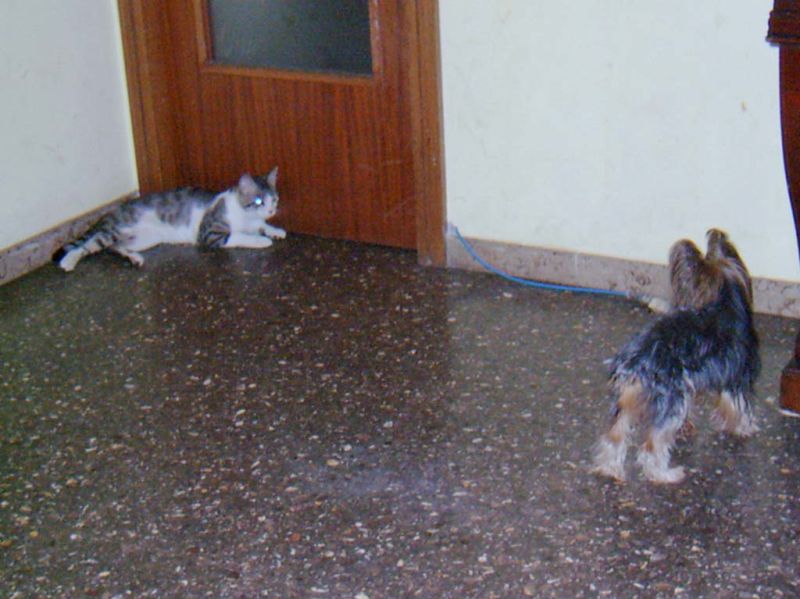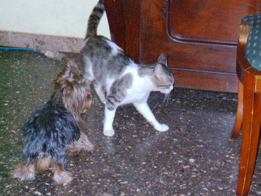 Ya vienen pasando varios meses desde que los niños de mi ex me dicen que el perro se está comportando de forma extraña, a resultas que entró en el hogar un nuevo animal: un gato... al que apodan Oliver. Resulta que el perro está aprendiendo por momentos costumbres y hábitos del gato. No sé, por ejemplo, se pone a jugar con pelotitas en cuanto le ve al gato hacerlo. Se dedica a "intentar" saltar del sofá al suelo, y del suelo a la cama, como hace el gato. Incluso hasta se ha vuelto más limpio y más juguetón! Es decir, como me dicen los chavales, el perro está aprendiendo habilidades gatunas, jajaja.